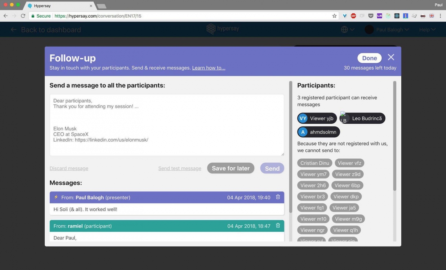 Hypersay is the one-stop shop for event tech services.Your event, your way: from small to global, from multi-language to multi-day events and everything in between. Our family of products will turn even the most complex event into a great, memorable experience for everyone, from your team to your guests.