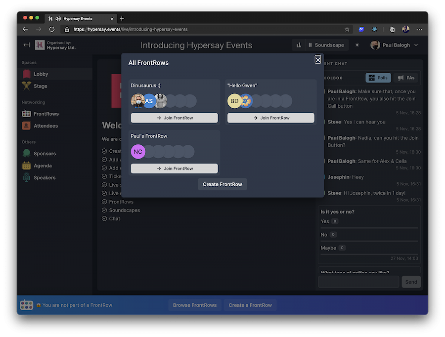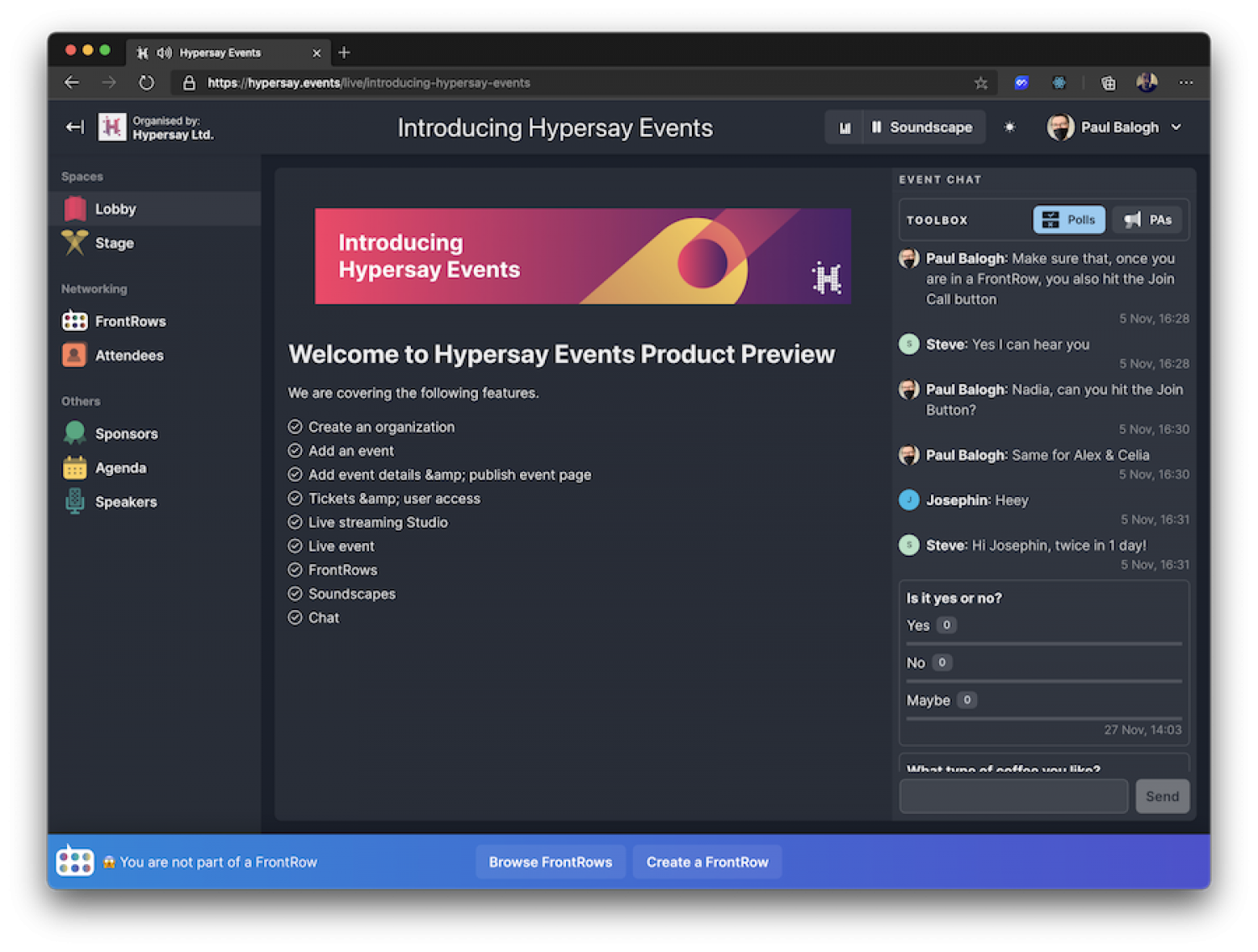 Hypersay Events is a second-generation digital events platform, offering unique tools (such as FrontRow) to create emotional connections.